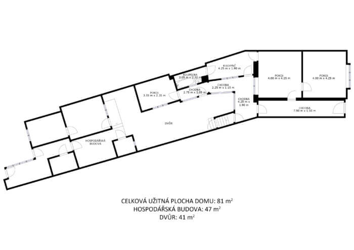 Dům je postaven z cihel a v současnosti nabízí tři pokoje, prosklenou verandu, hospodářské stavení a také původní venkovní „černou kuchyni“. Součástí domu je malý sklep vhodný pro uskladnění ovoce a zeleniny.