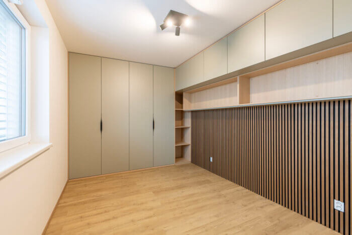 - Úložné prostory vestavěné skříně v ložnici i obýváku, není nutnost pořizovat další nábytek