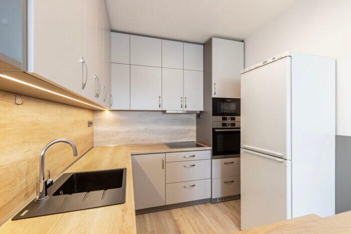 - kuchyňský kout se spotřebiči (lednice, mrazák, trouba, indukce, myčka, mikrovlnka)